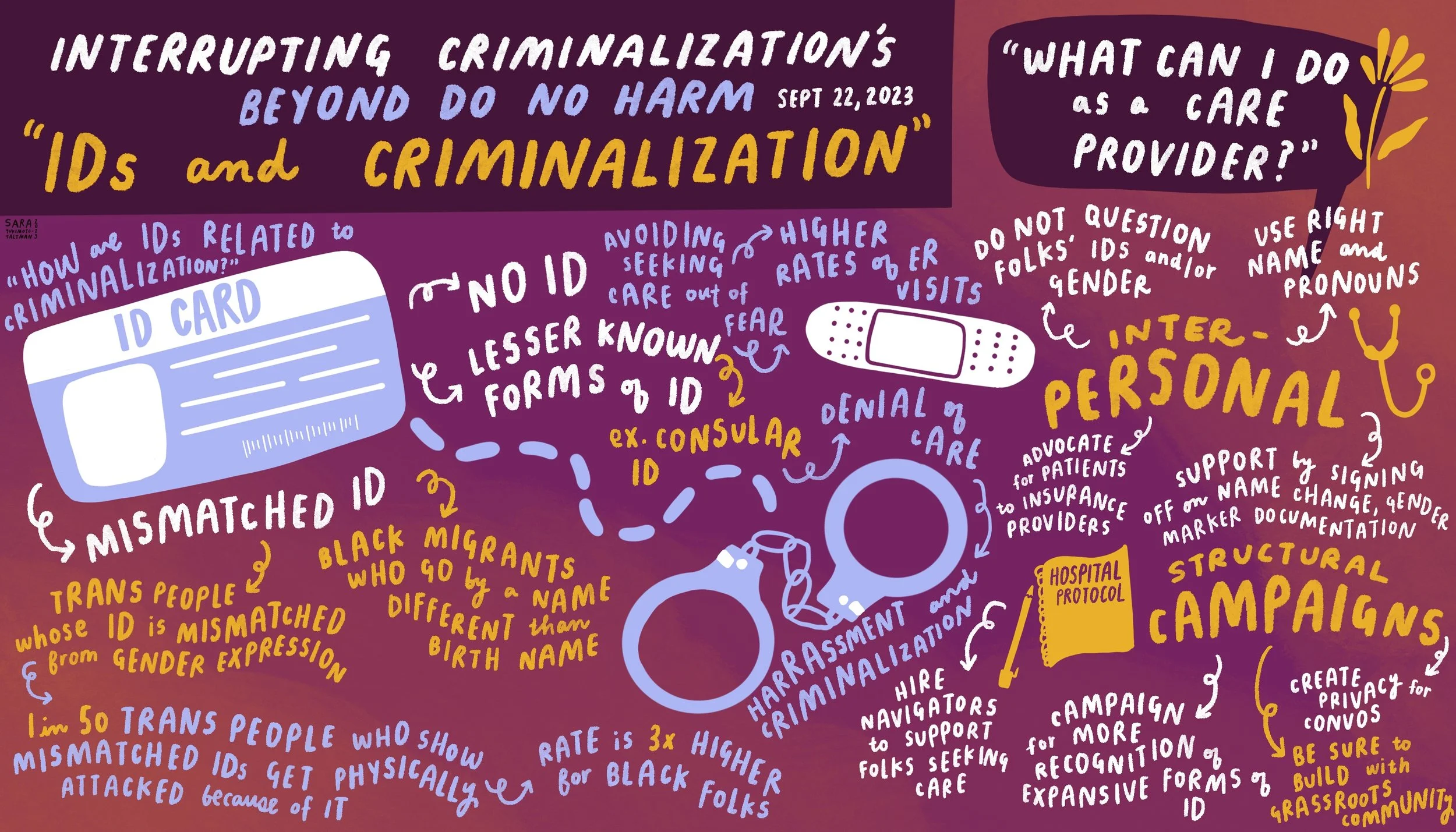 Image id: Interrupting Criminalization’s Beyond Do No Harm “IDs and Criminalization” Sept 22, 2023. First heading: “How are IDs Related to Criminalization? Mismatched ID: Trans People who ID is mismatched from gender expression, 1 in 50 trans people who show mismatched IDs get physically attacked because of it, rate is 3x higher for Black folks. Black migrants who go by a name different than birth name. No ID - avoiding seeking care out of fear —> higher rates of ER visits. Lesser known forms of ID —> example, consular ID —> denial of care, harassment and criminalization. Next section: What can I do as a care provider? Interpersonal: Do not question folks’ IDs and/or gender, use right name and pronouns, advocate for patients to insurance provideres, support by signing off on name change, gender marker documentation. Structural campaigns: hospital protocol - higher navigators to support folks seeking care, campaign for more recognition of expansive forms of ID, create privacy for convos, be sure to build with grassroots community.