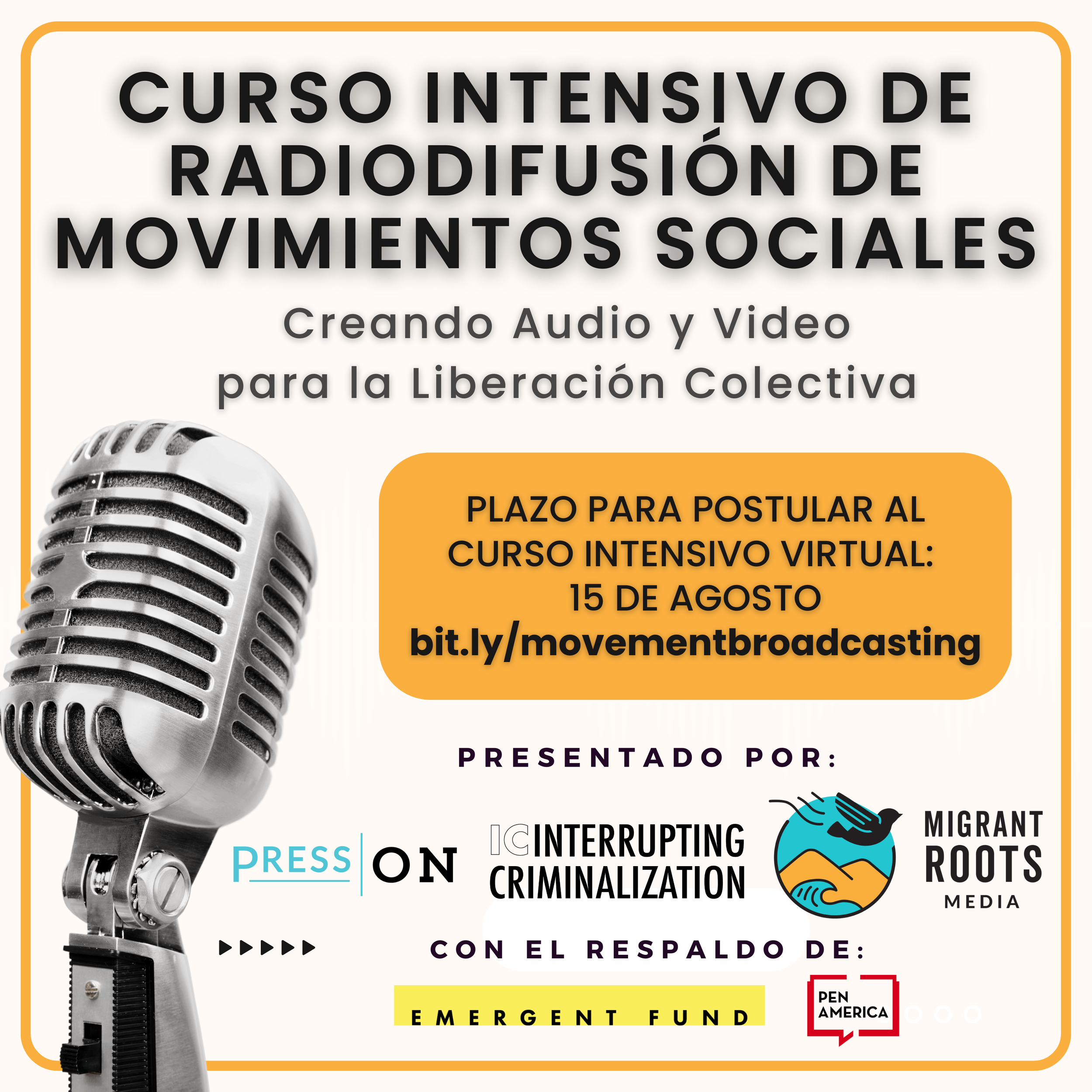 Esta serie de cursos intensivos práctico de 12 sesiones cubrirá el análisis de causas raíz, entrevistas y grabación en campo 101, producción de audio, producción de video, guiones, promoción y distribución, consideraciones legales, ética periodística/documental, recaudación de fondos de las bases comunitarias para transmisión en medios, y proporcionará oportunidades para formación de redes, construcción de relaciones y estrategia. Está diseñada para organizadores de bases comunitarias y creadores de medios en la vanguardia de la abolición y justicia transformadora, justicia inmigrante y construcción del movimiento Sureño con una variedad de niveles de habilidad, pero con una idea clara del proyecto en el que desean trabajar, ya sea una historia oral, una serie de entrevistas, un programa (show) o canal, una campaña en redes sociales, o reportaje en vivo desde protestas o eventos. La serie se adapta a la situación de las personas en términos de equipo y presupuesto, e incluye recomendaciones sobre cómo usar herramientas gratuitas y de fácil acceso.