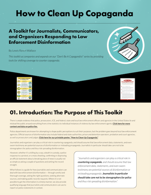 This online resource accompanies and expands on our Don’t Be A Copagandist series by providing tools for shifting coverage to counter copaganda.