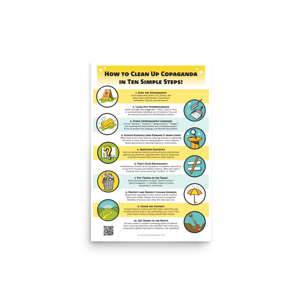 We also have a How to Clean Up Copaganda poster, which sums up ten key ways journalists and media makers can cut through authoritarian and pro-police propaganda by getting to root causes, avoiding sensationalizing, and refusing to repeat police lies. Check it out and order prints to put above your desk or post in your newsroom or community!